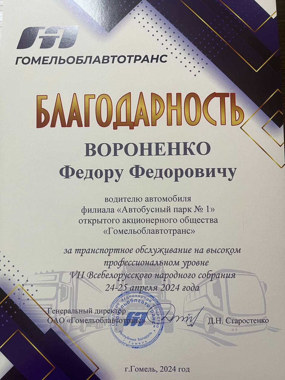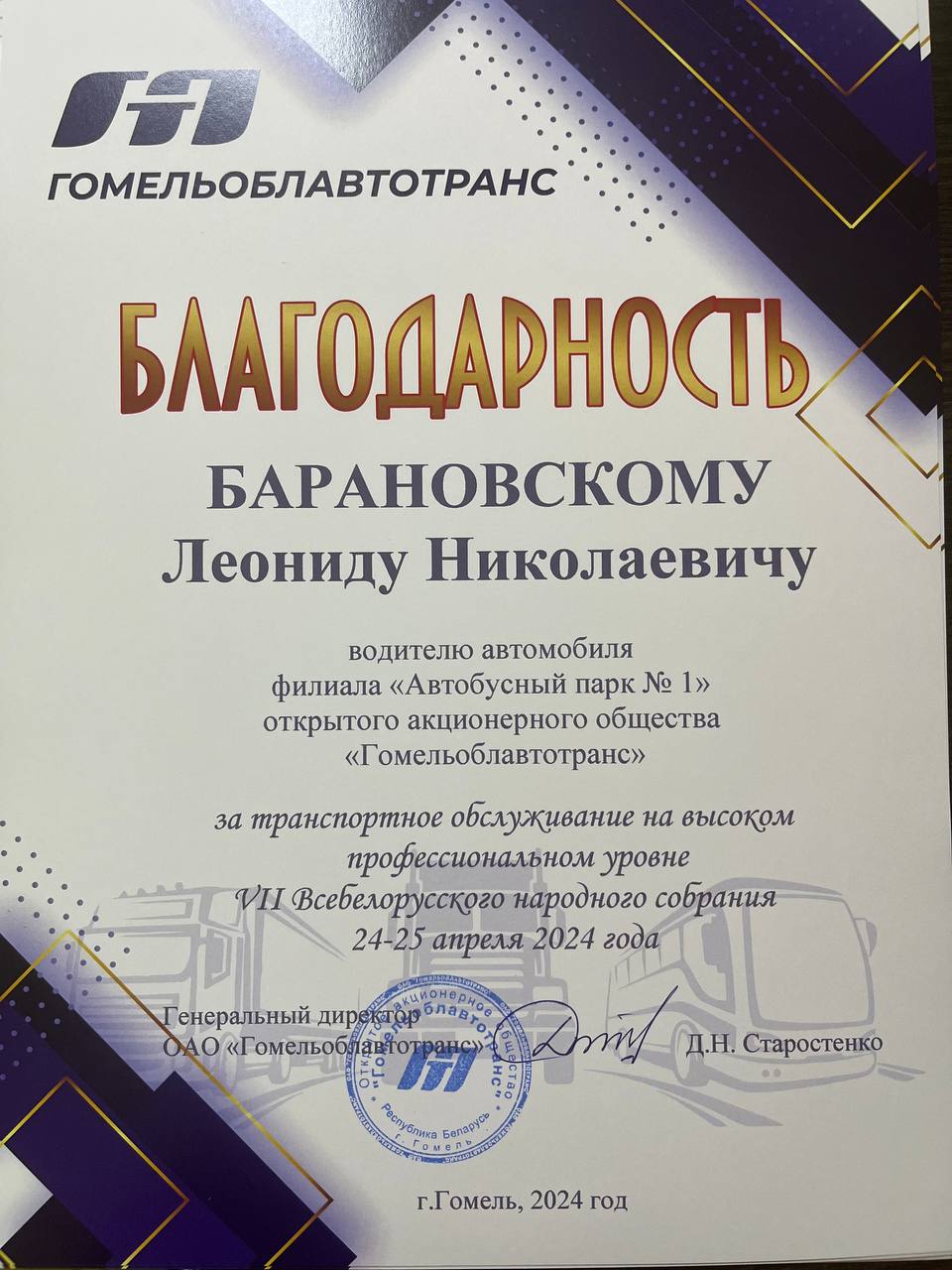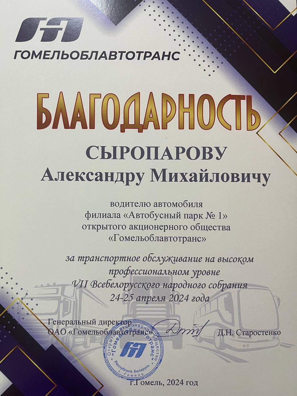 За организацию и транспортное обслуживание на высоком профессиональном уровне VII Всебелорусского народного собрания 24-25 апреля 2024 года водителям ПЕРВОГО автобусного парка объявлена Благодарность ОАО «Гомельоблавтотранс»