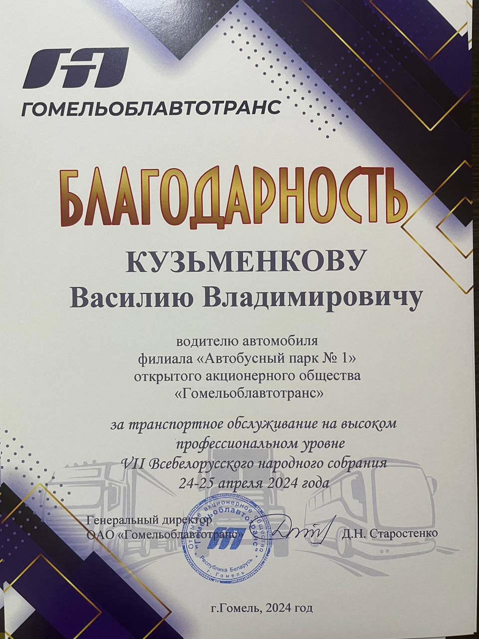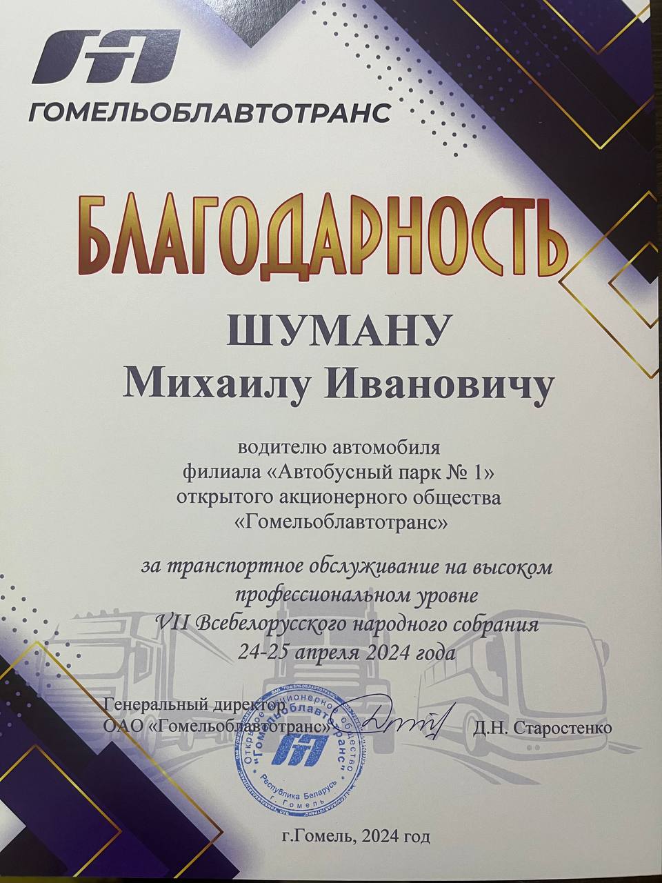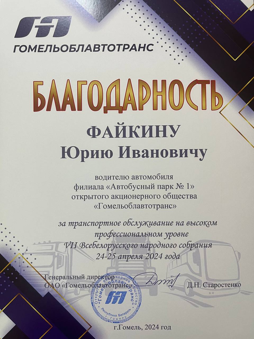 За организацию и транспортное обслуживание на высоком профессиональном уровне VII Всебелорусского народного собрания 24-25 апреля 2024 года водителям ПЕРВОГО автобусного парка объявлена Благодарность ОАО «Гомельоблавтотранс»