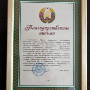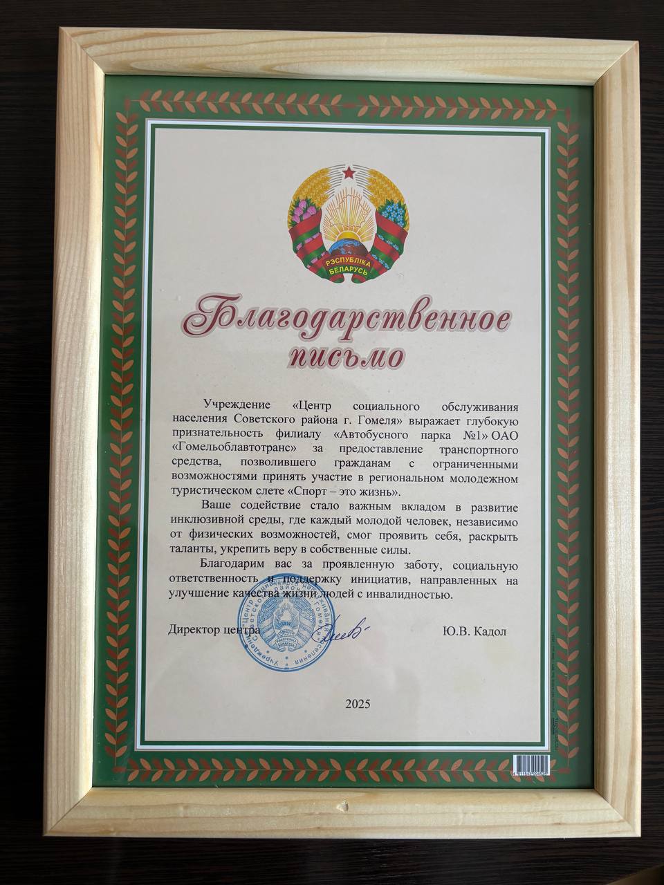 Учреждение «Центр социального обслуживания населения Советского района г. Гомеля» выражает глубокую признательность филиалу «Автобусного парка Nº1» OAO «Гомельоблавтотранс» за предоставление транспортного средства, позволившего гражданам с ограниченными возможностями принять участие в региональном молодежном туристическом слете «Спорт — это жизнь».