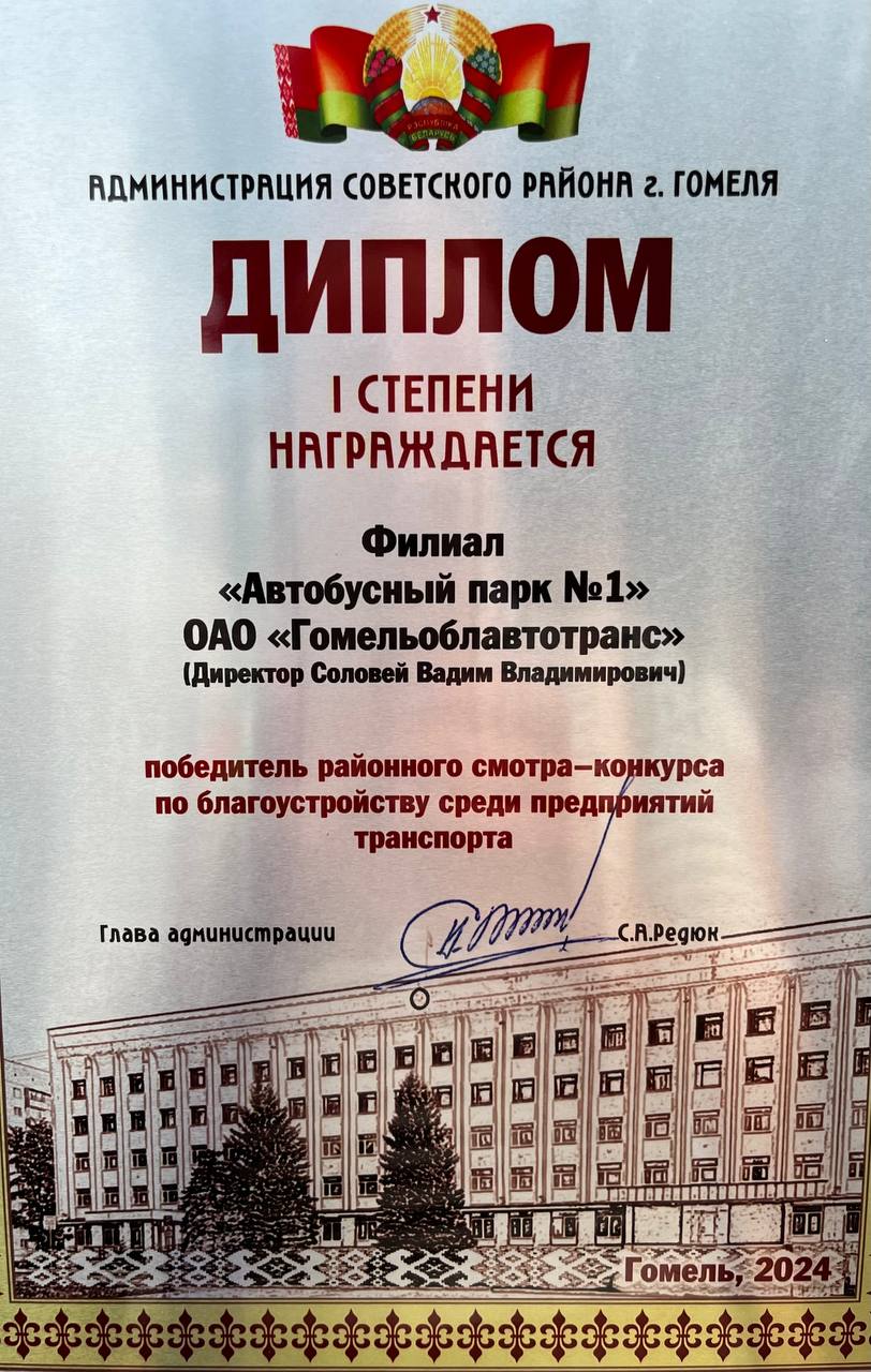 ПЕРВЫЙ автобусный парк был награжден Дипломом l степени районного смотра-конкурса по благоустройству среди предприятий транспорта.